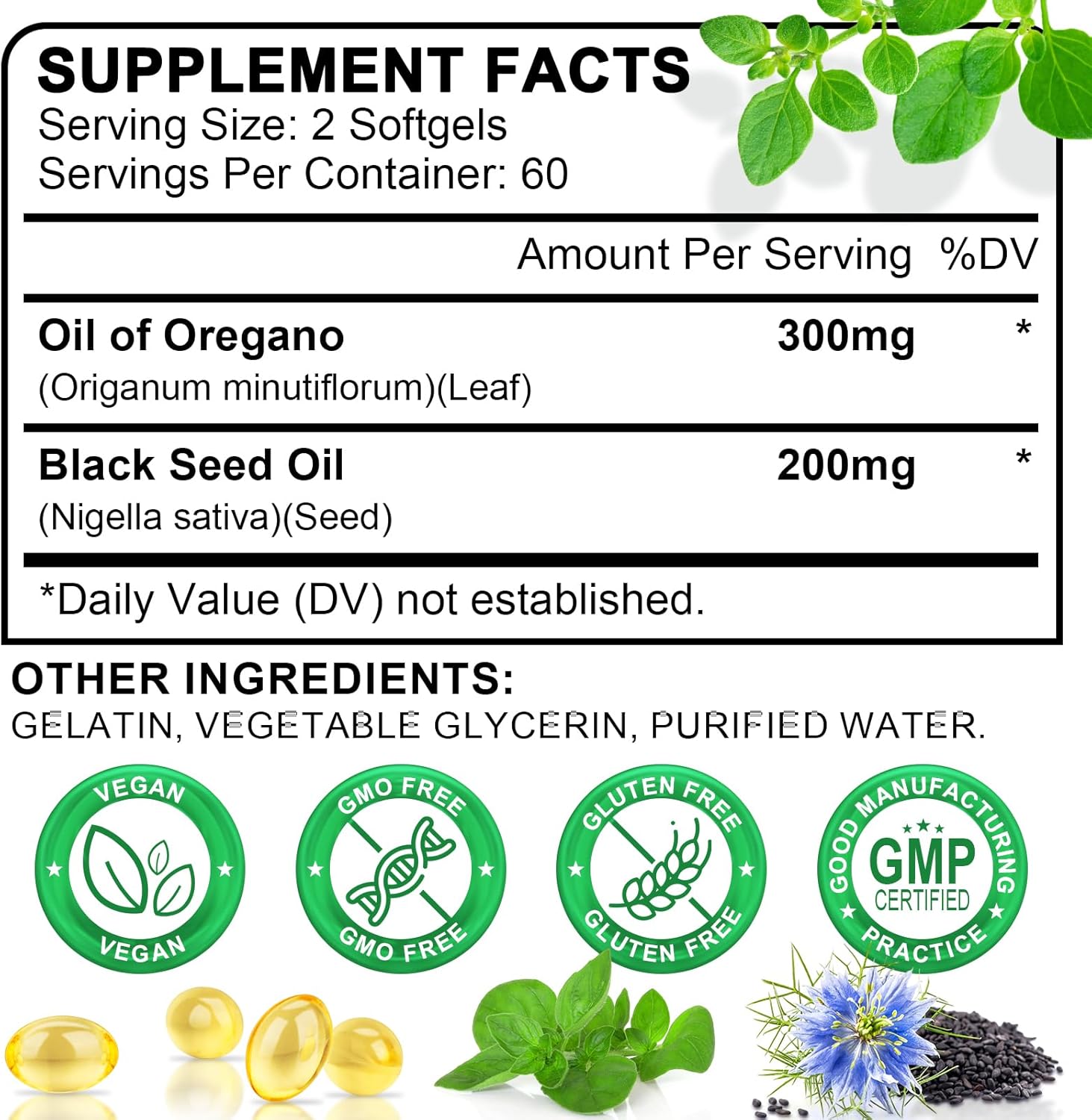 - 2 in 1 Oil of Oregano Supplement:Experience the potency of a fresh 20:1 extract with Oil of Oregano from Origanum minutiflorum leaves and Black Seed Oil from Nigella sativa per serving. Oil of oregano with black seed oil are combined into one and work together